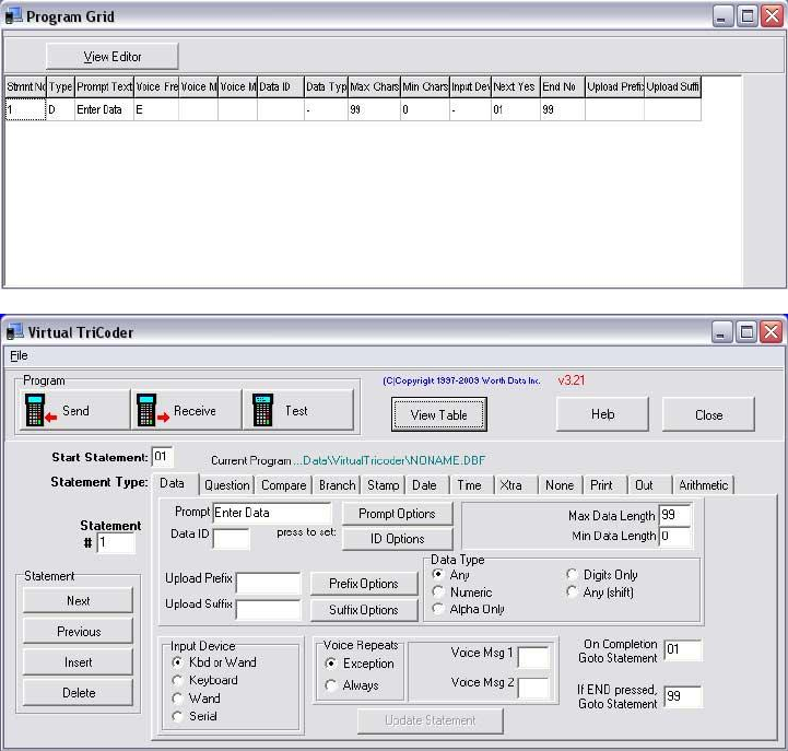 From this screen you can start to create a new TriCoder Program. By default the View Table (Program Grid) is activated and will